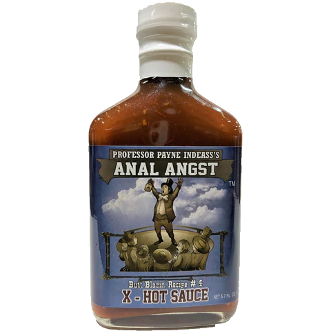Professor Payne Indeass has spent years to perfect his Anal Angst X-Hot Sauce, and here it is in all its glory. This sauce is made with Habanero peppers, soy sauce , Worcestershire sauce and garlic. As good as it tastes going down, you're going to have a rough time tomorrow morning.Ingredients: Habanero peppers, soy sauce, Worcestershire sauce, garlic and xanthan gum.